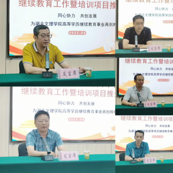 襄阳容大教育培训学校校长曾晓辉、谷城县英才培训学校校长曾凡成、襄阳市心桥职业培训学校书记管慧东、武汉市中禹华图教育培训学校有限公司经理黄汉章、十堰市茅箭区硕博教育学校校长喻明5名教学点代表进行了交流发言,就太阳集团高等学历继续教育招生政策落实情况及操作细节进行交流分享。